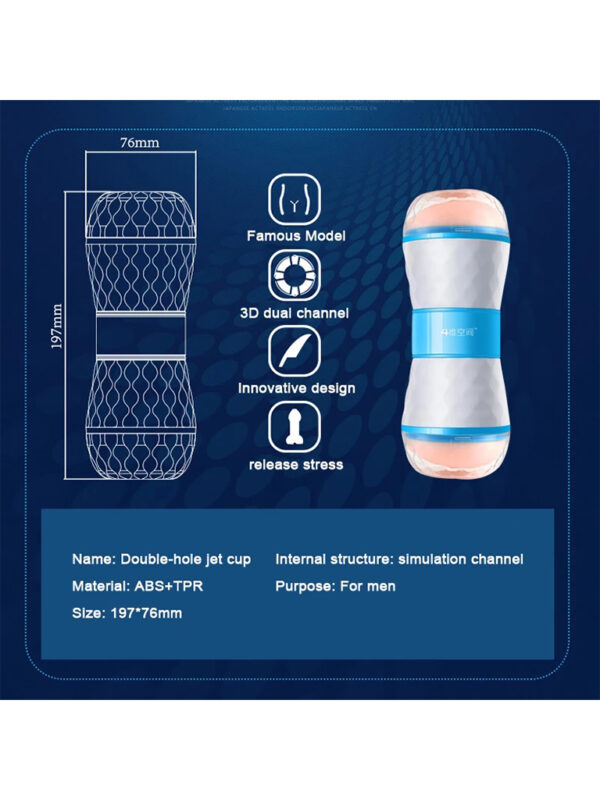 Posee dos suaves y apretadas entradas: una en forma de boca y la otra en forma de vagina. Cada entrada cuenta con diferentes texturas a lo largo de todo el túnel interno que simulan la respectiva cavidad real para una experiencia sin igual. Te darán una estimulación tan suprema que la palabra clímax se queda corta.